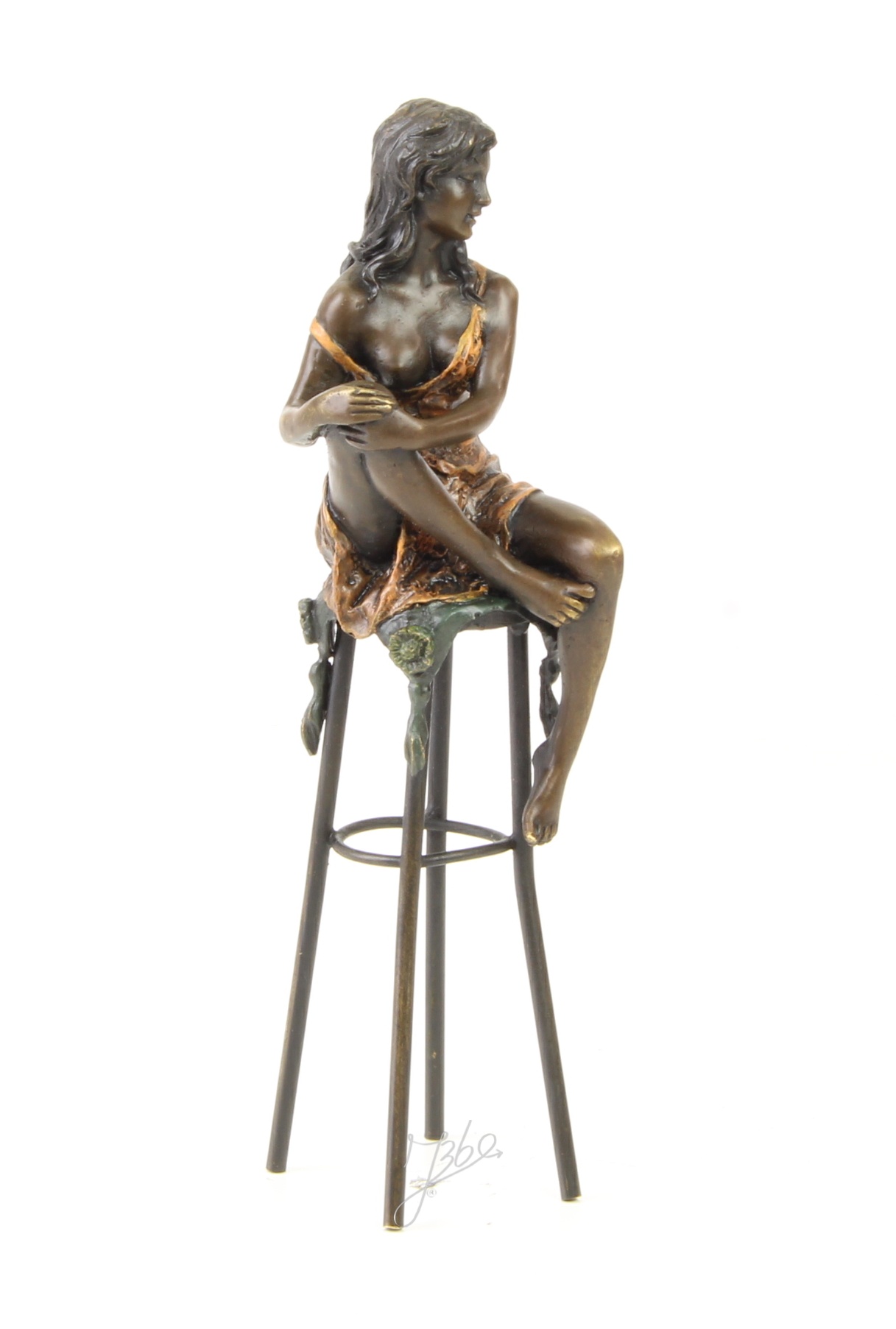 Bronzból készült art deco bárszéken ülő nőalak szobor, színes.