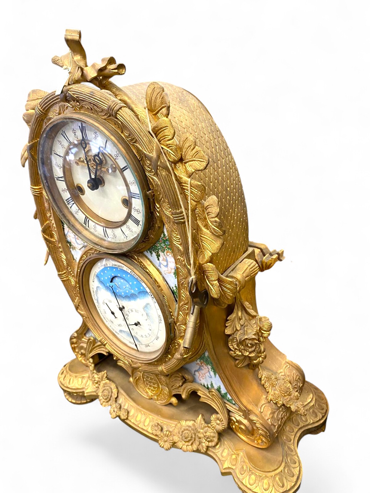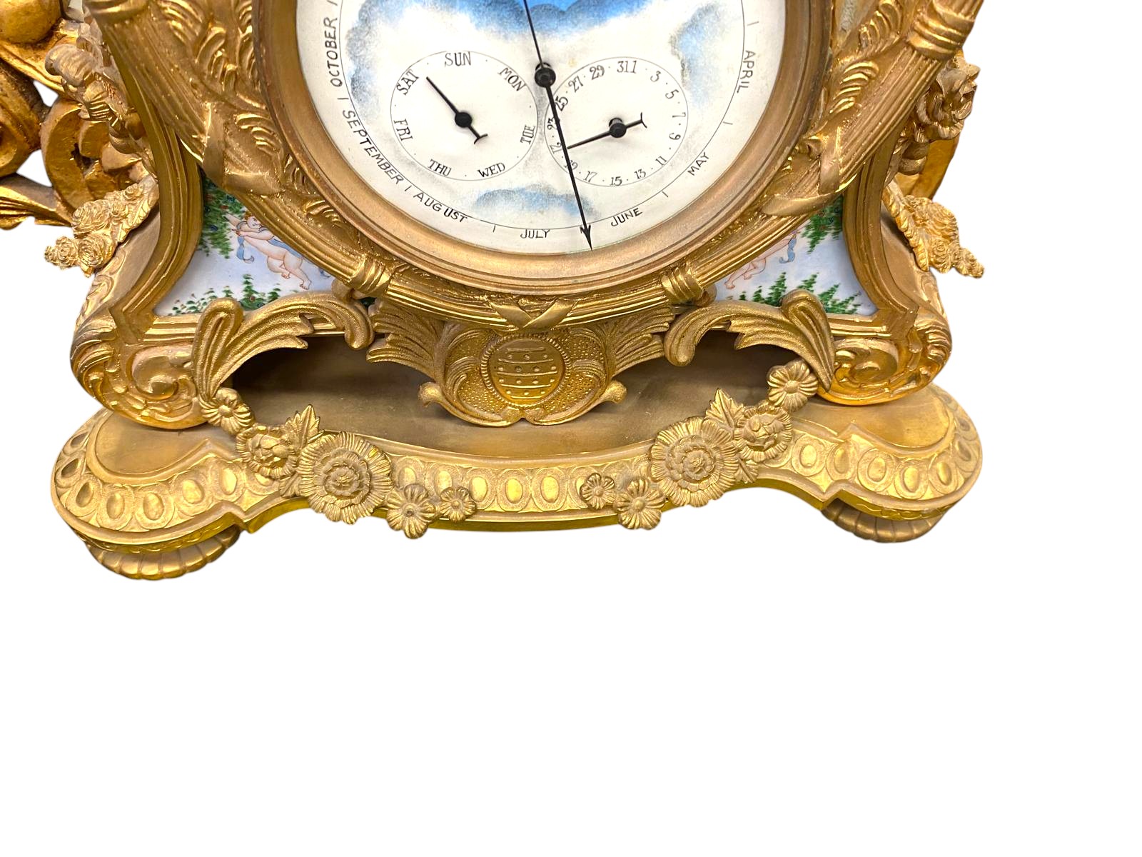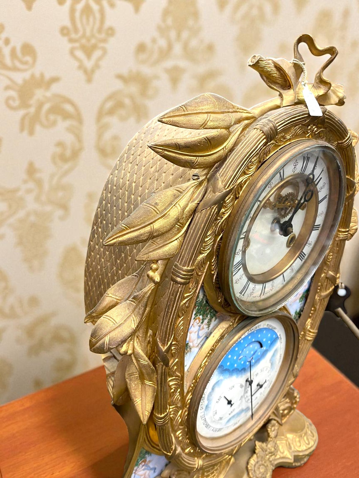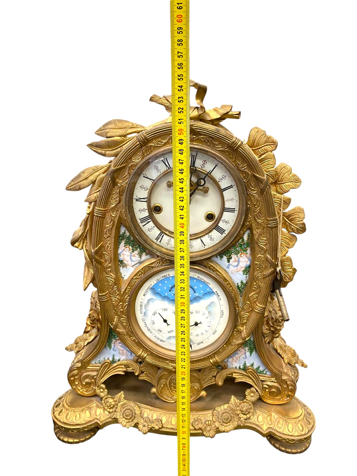 Jellemzők: Aranyozott bronz keret, festett porcelán számlapok és betétek.