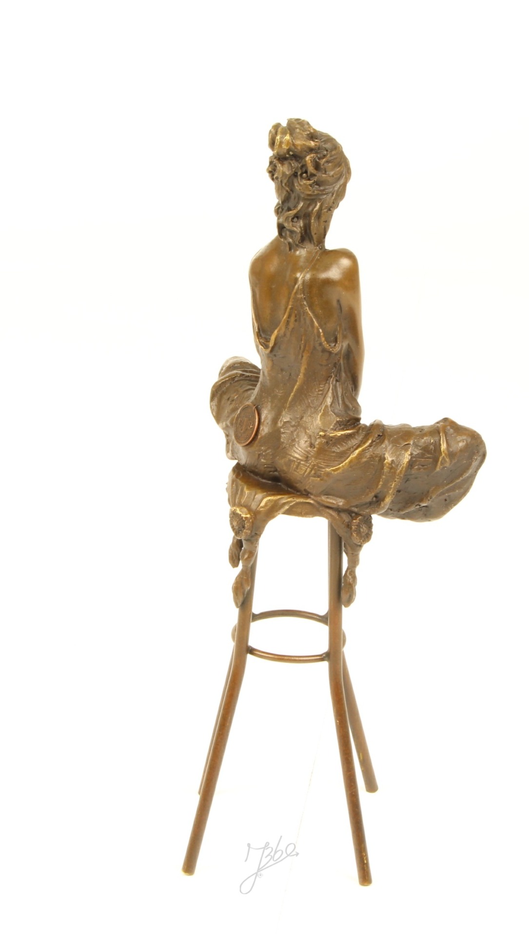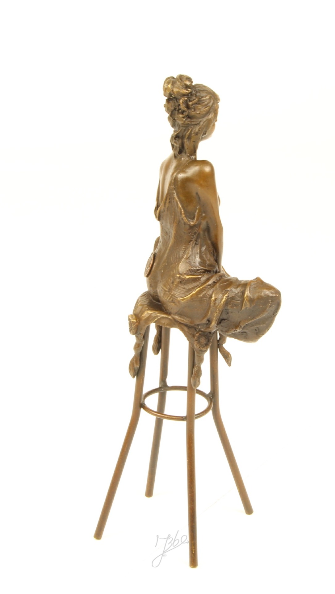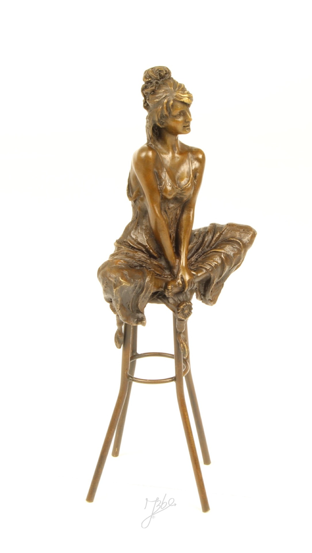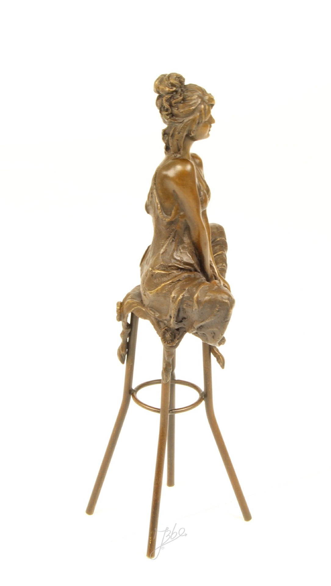 Bronzból készült art deco bárszéken ülő nőalak szobor, színes.