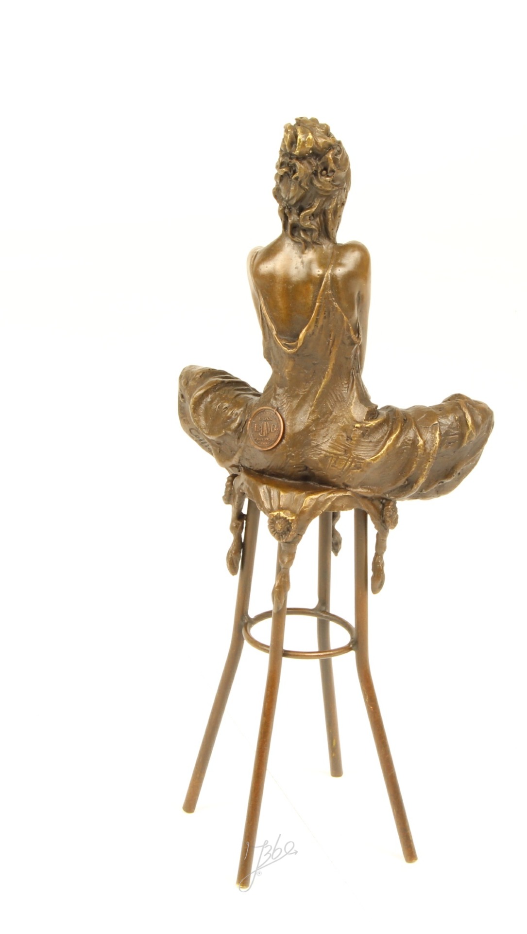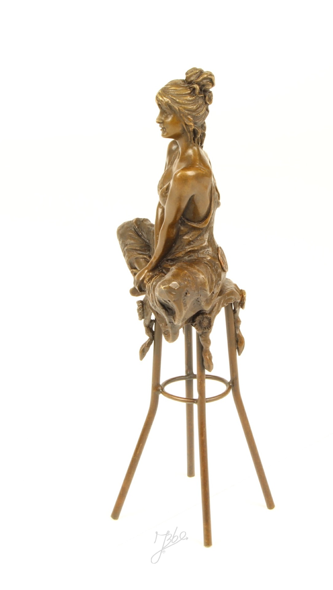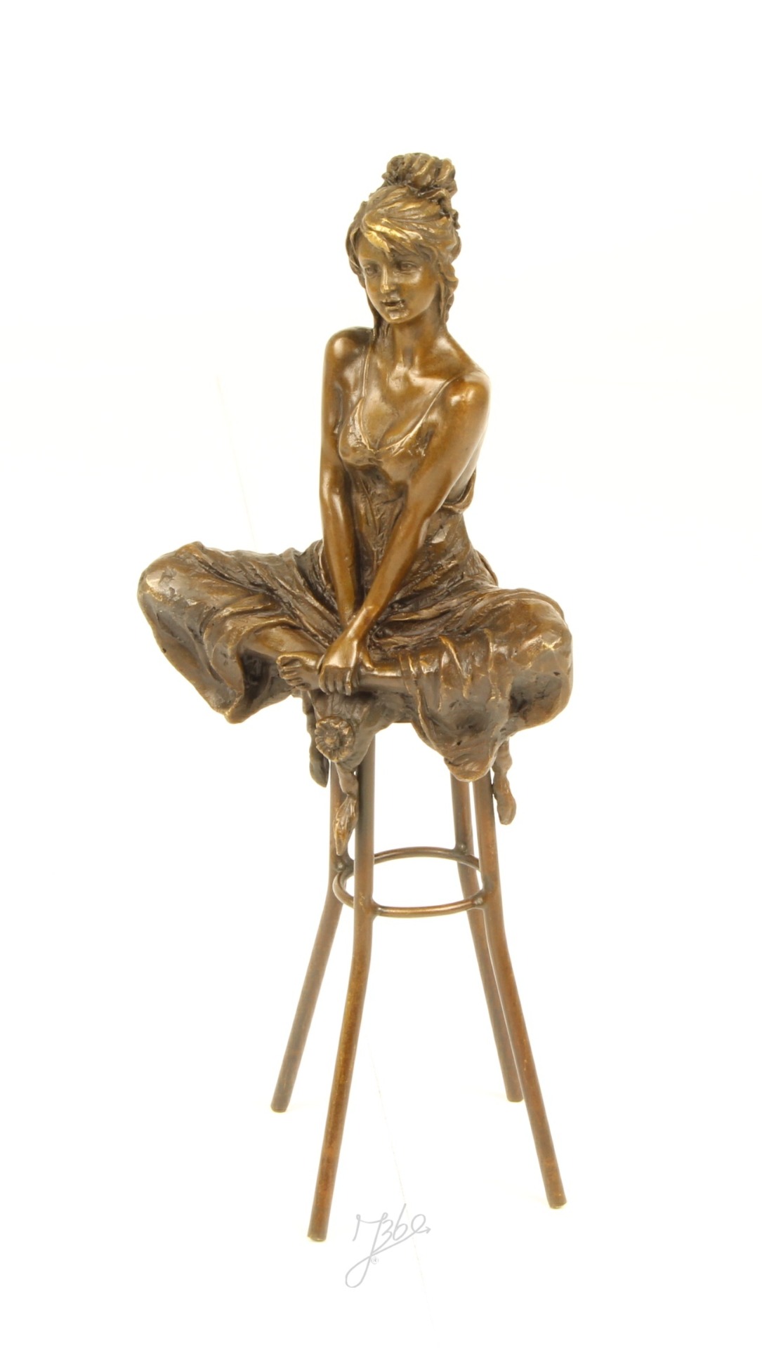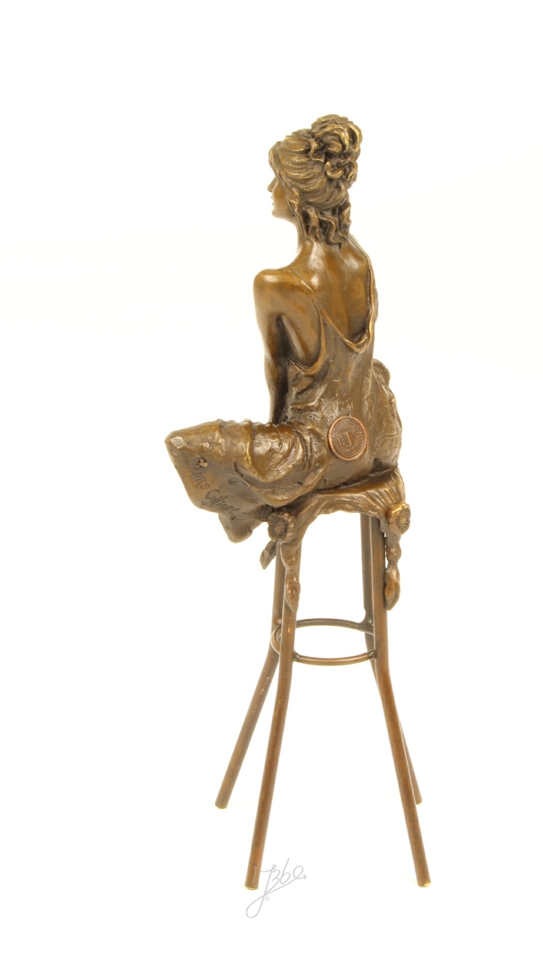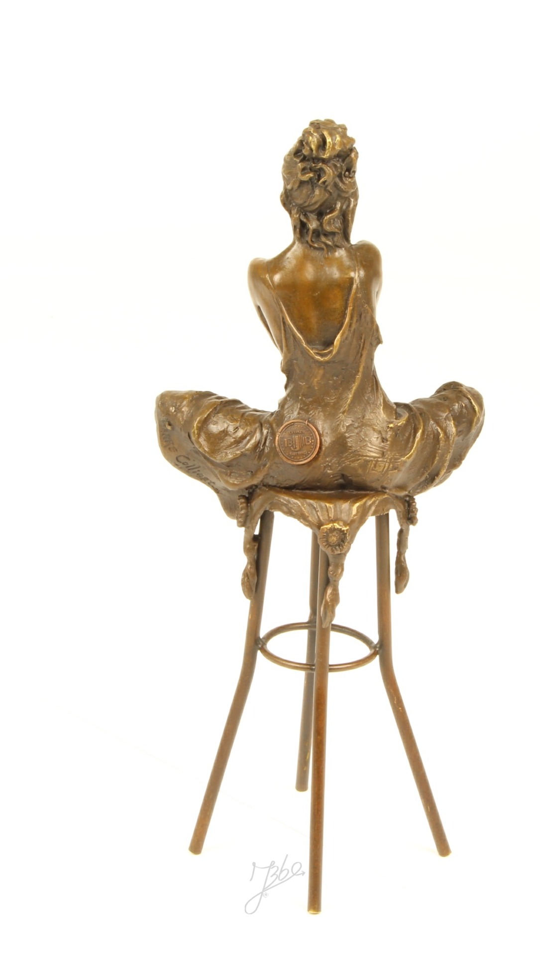 Bronzból készült art deco bárszéken ülő nőalak szobor, színes.