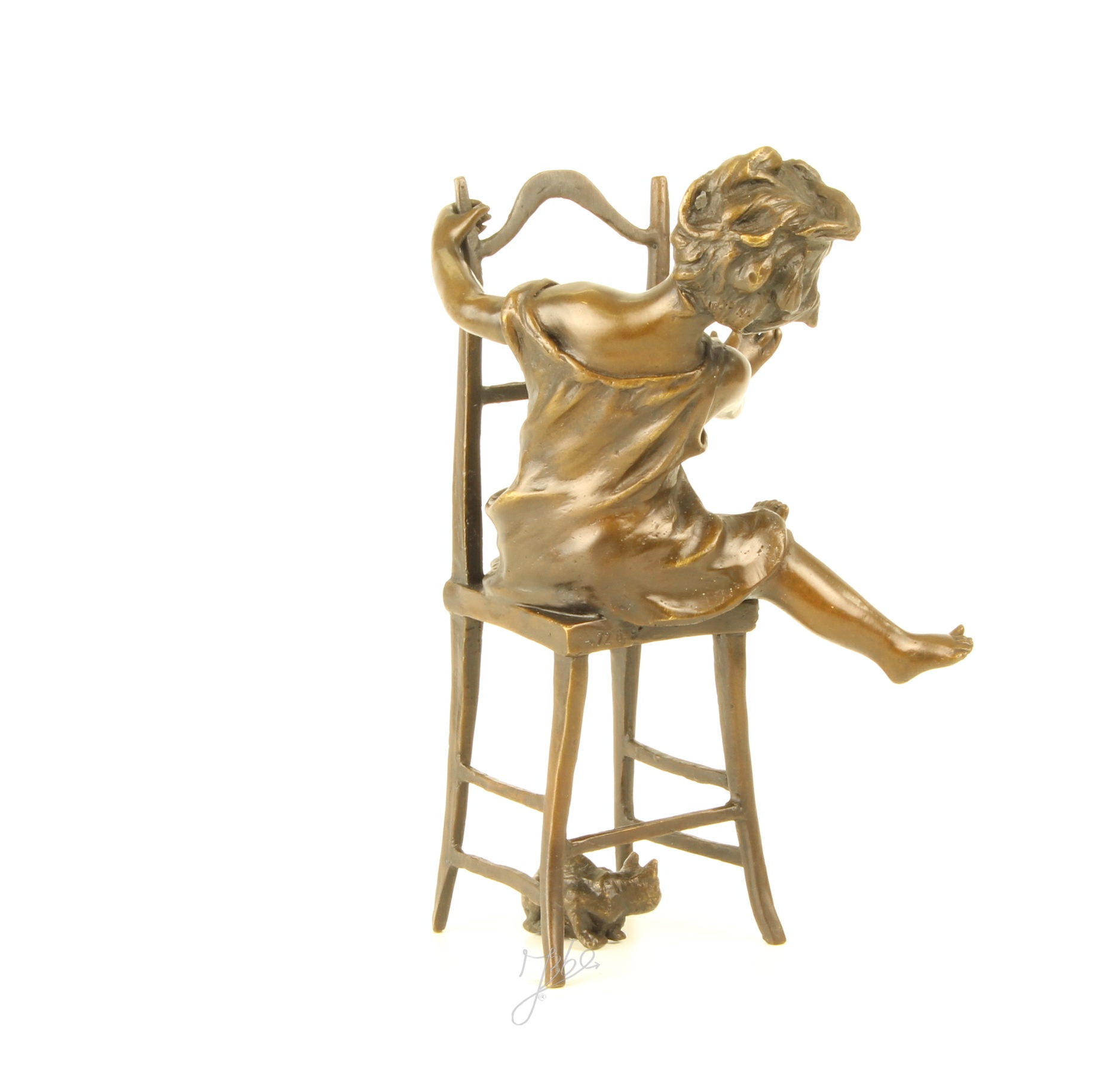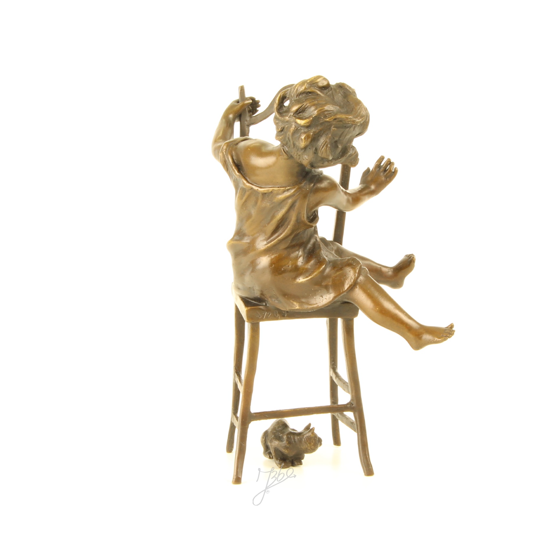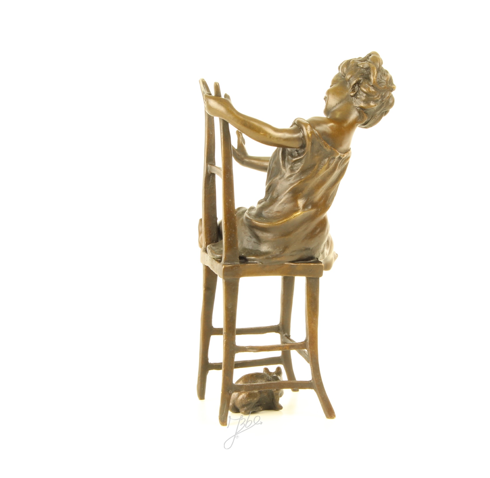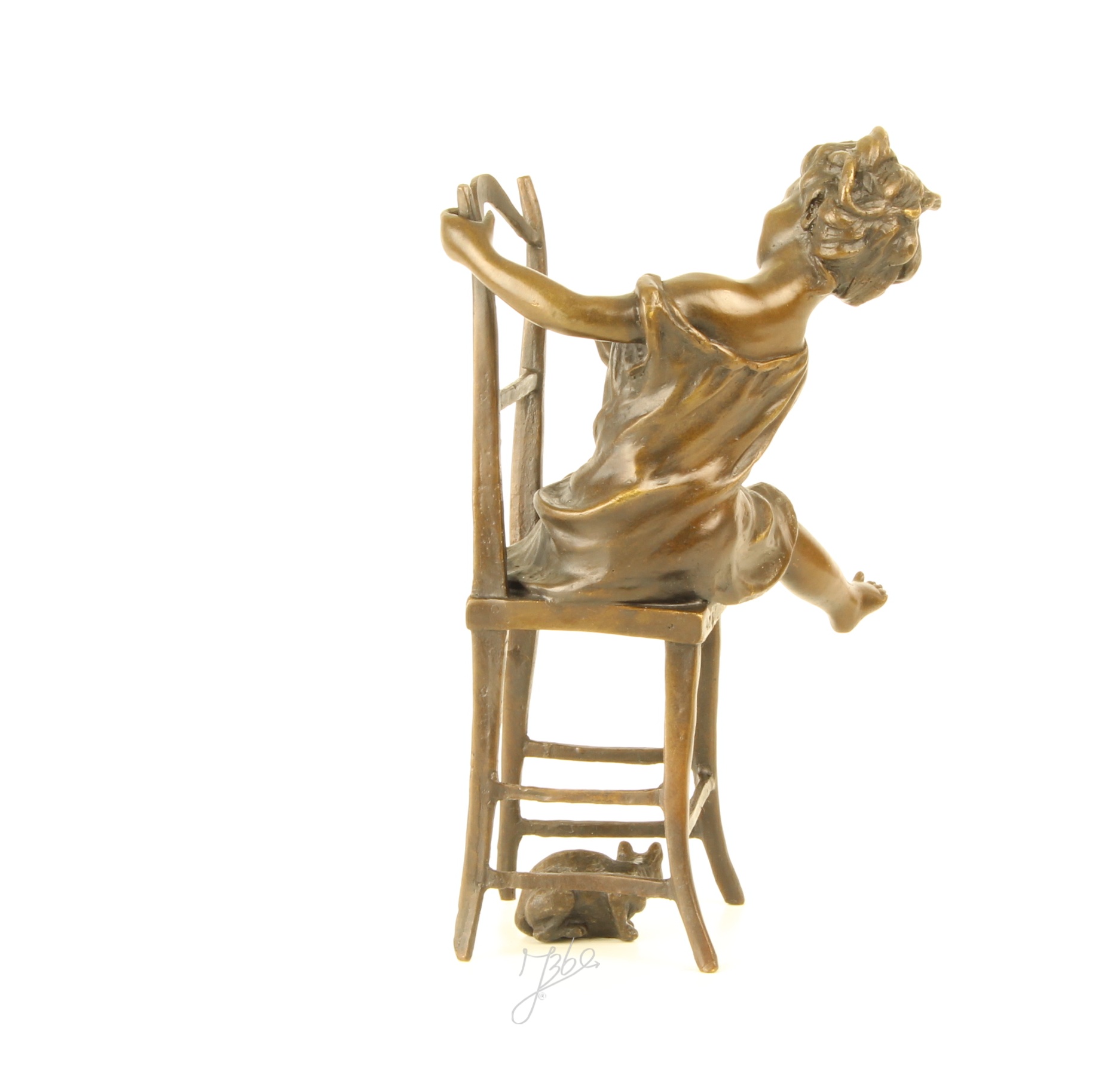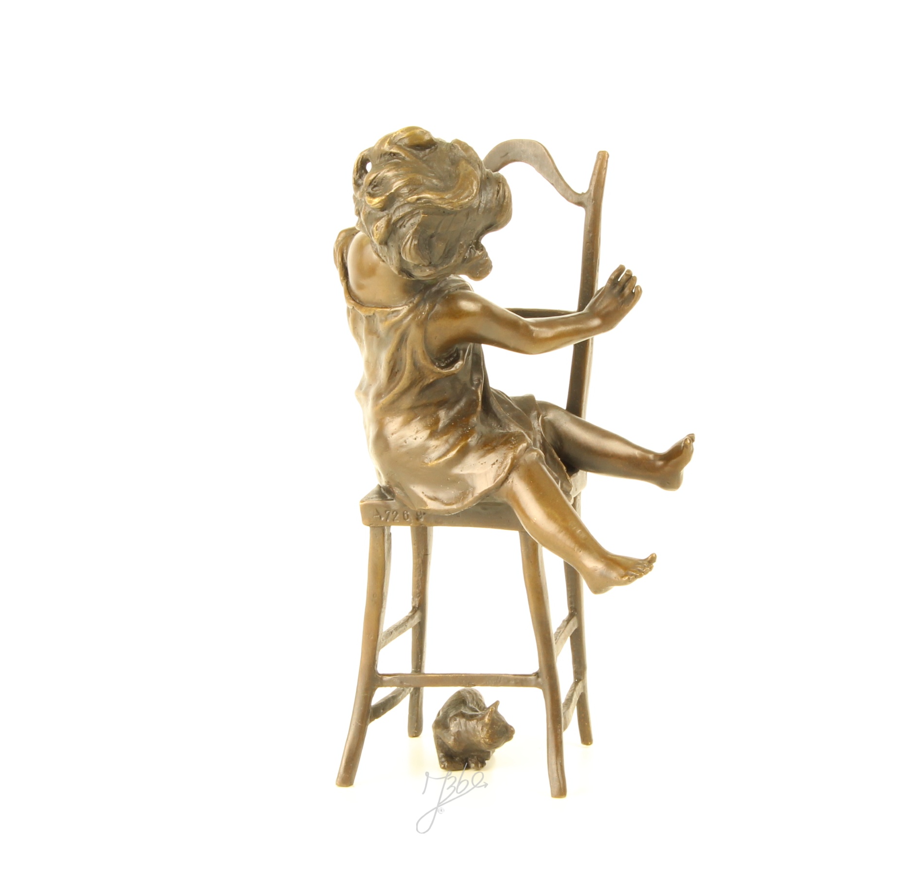 Ez a bronzszobor elbűvölően és szívmelengetően ábrázol egy fiatal lányt, aki játékos pillanatokat tölt macskatársával egy széken ülve.