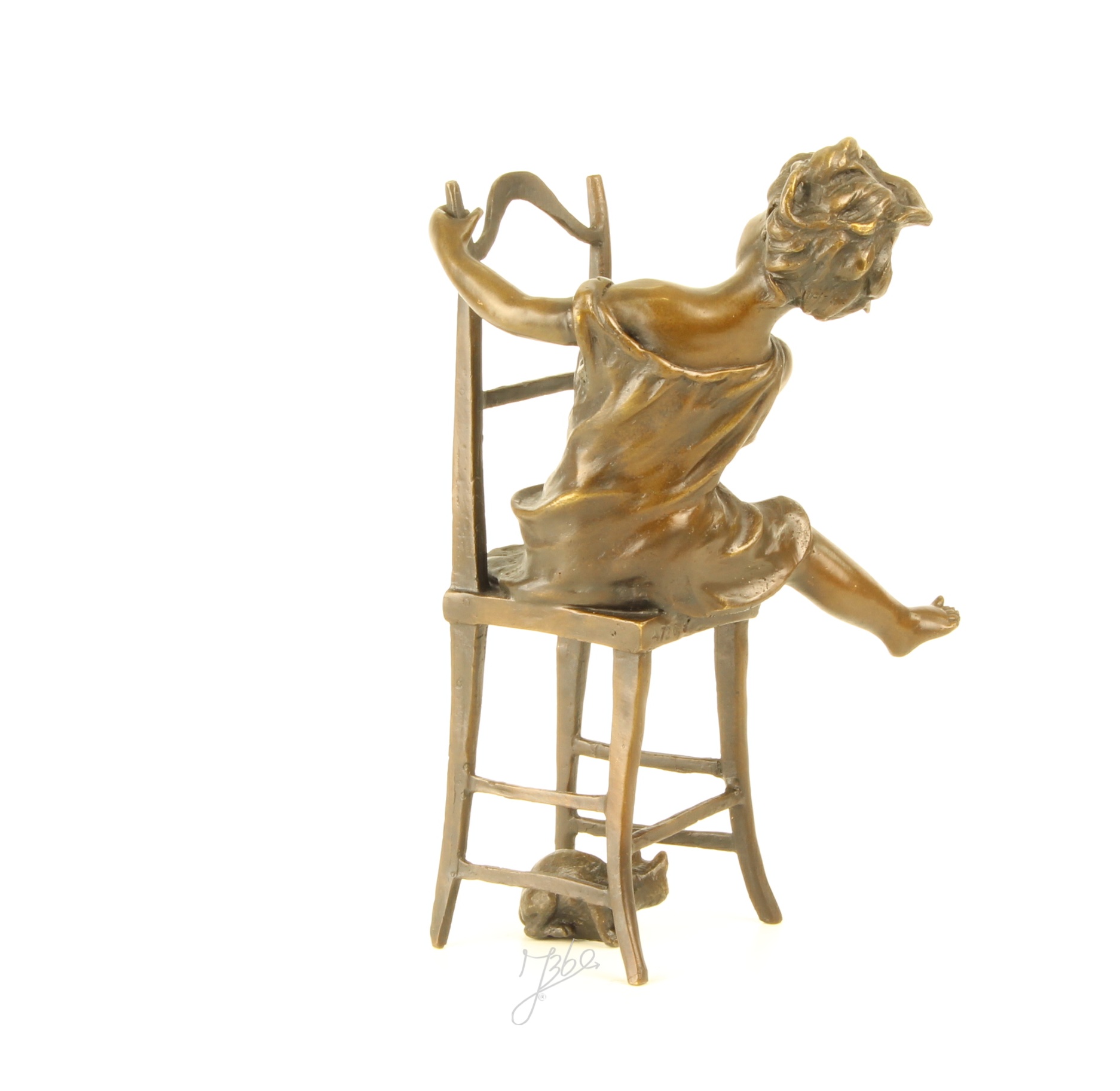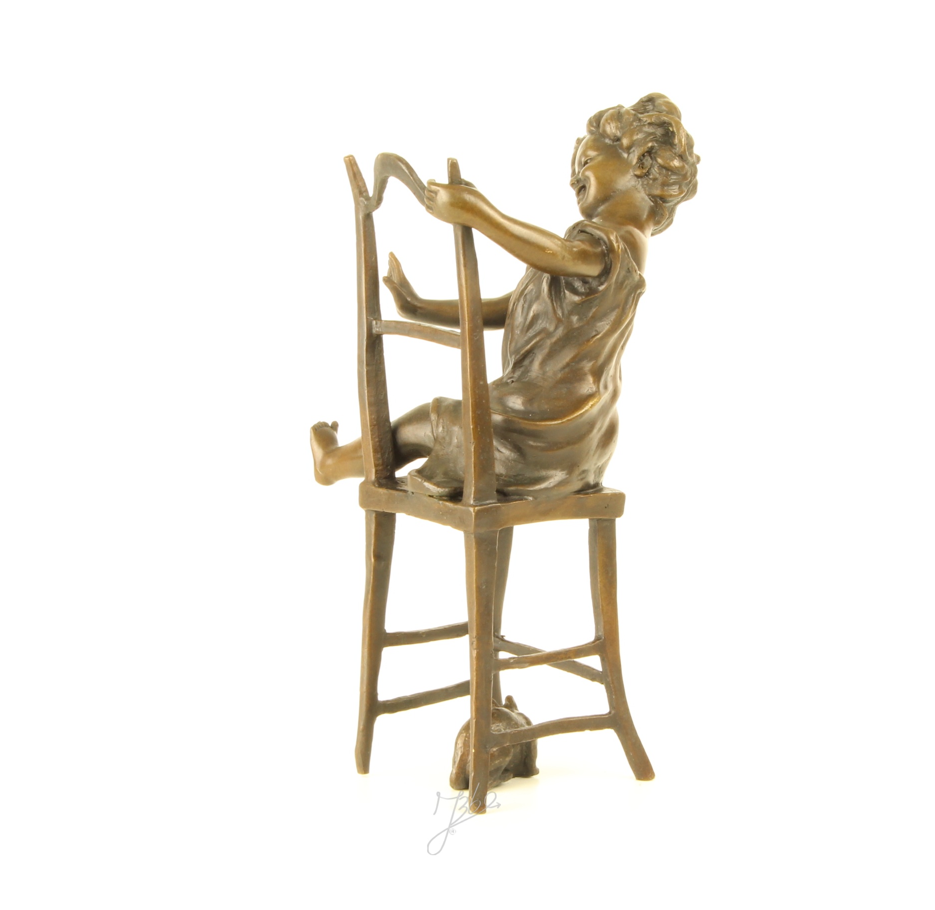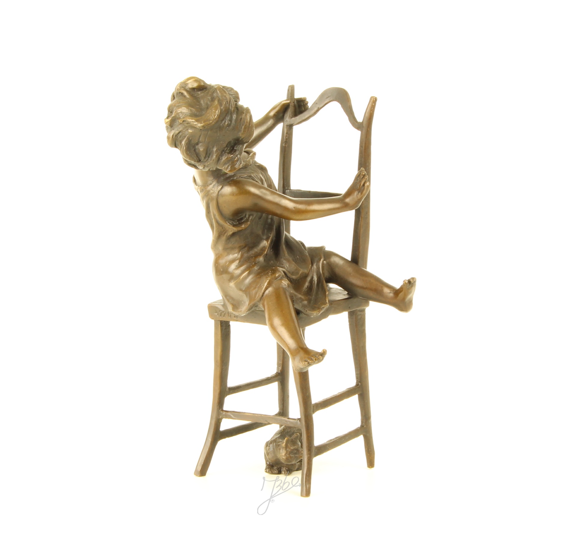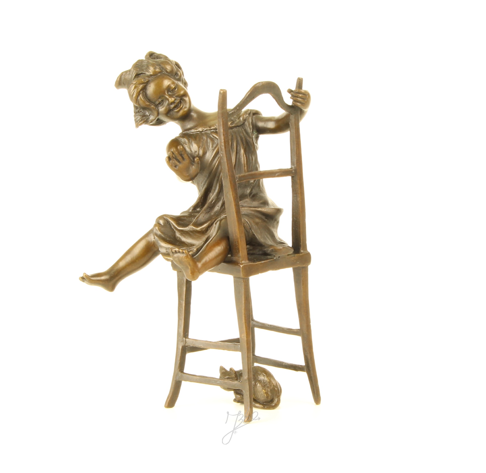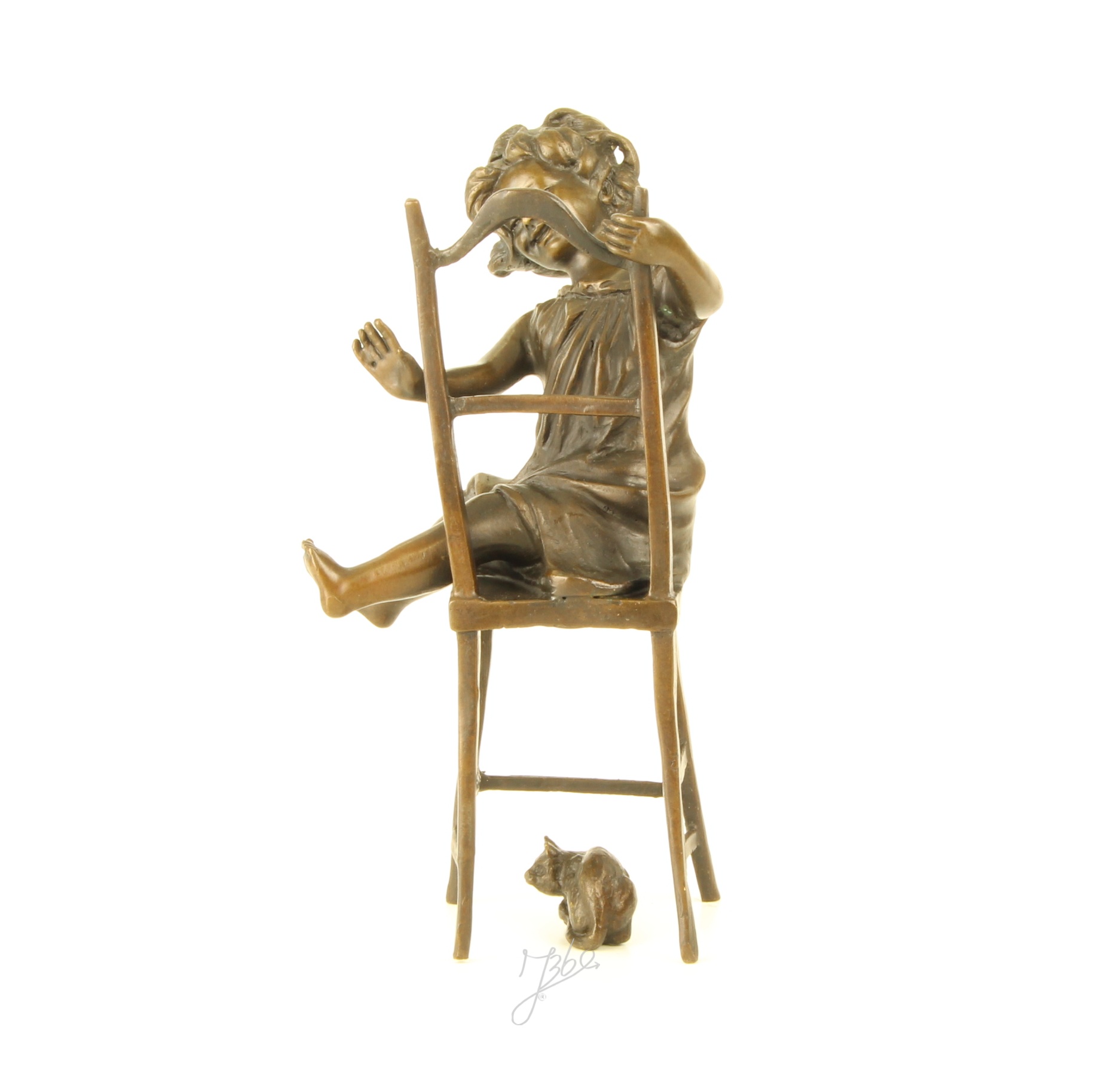 Ez a bronzszobor elbűvölően és szívmelengetően ábrázol egy fiatal lányt, aki játékos pillanatokat tölt macskatársával egy széken ülve.