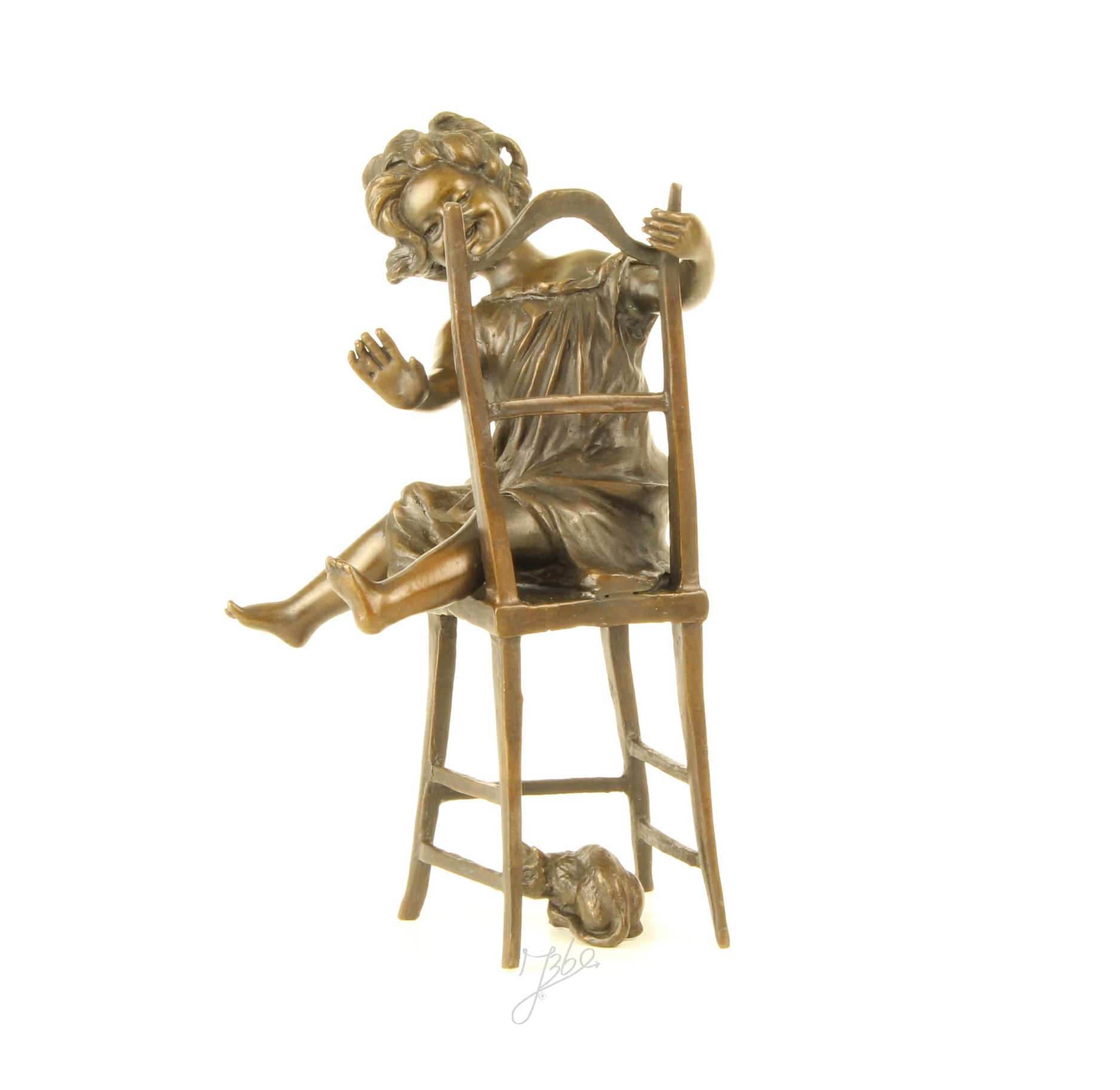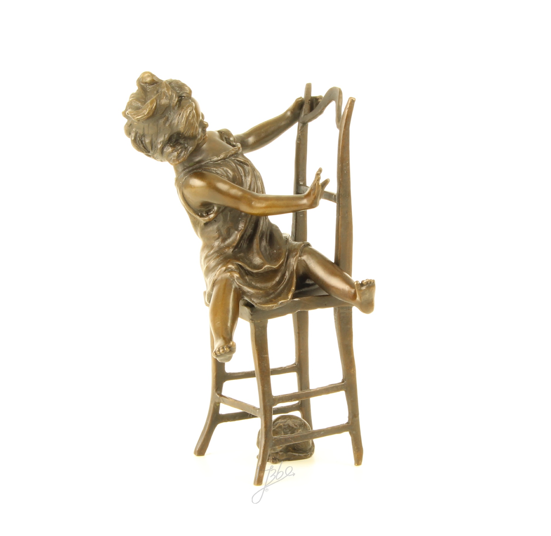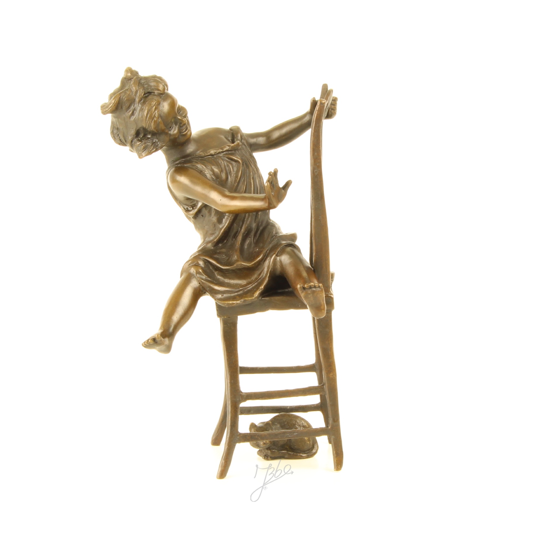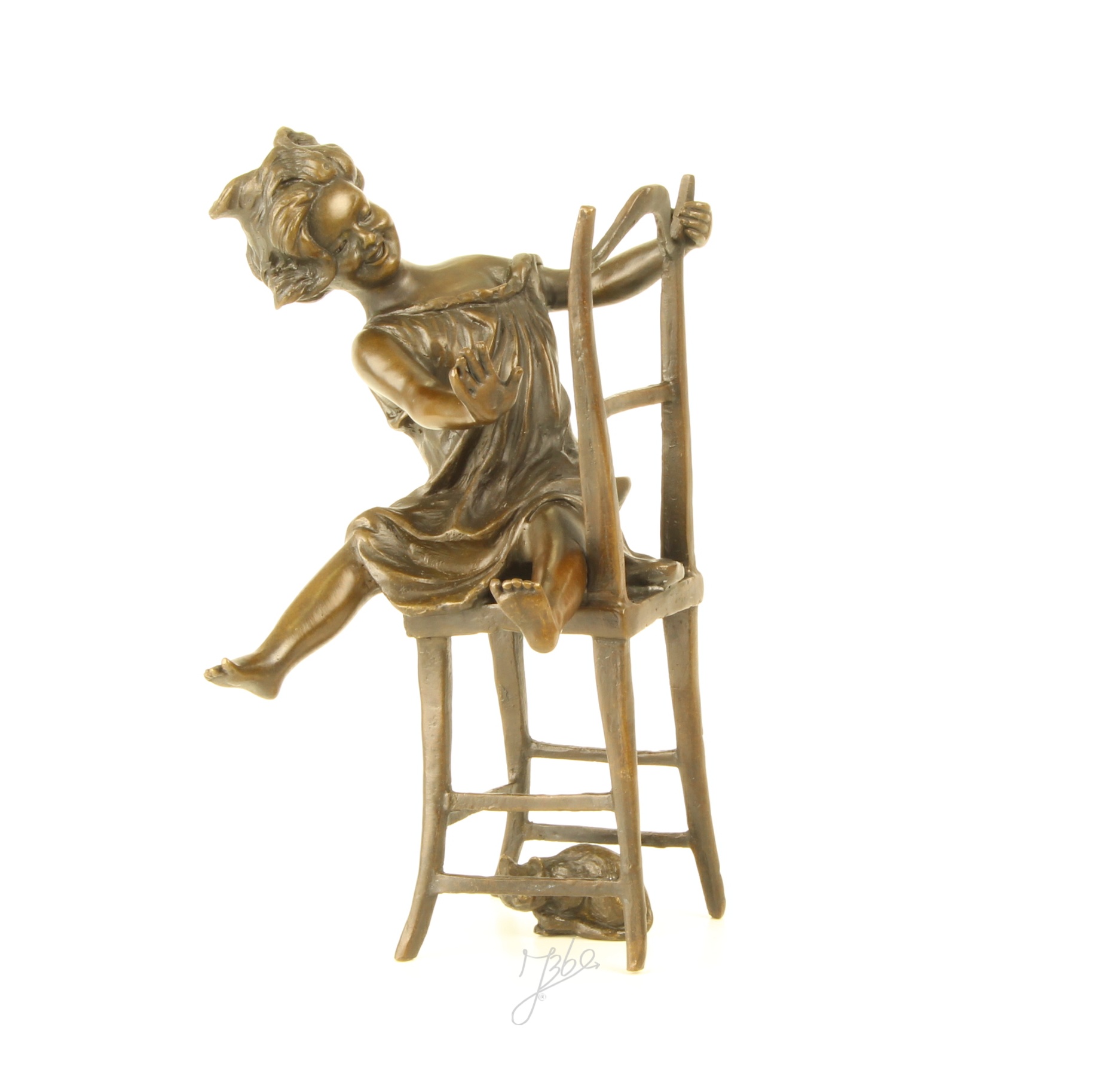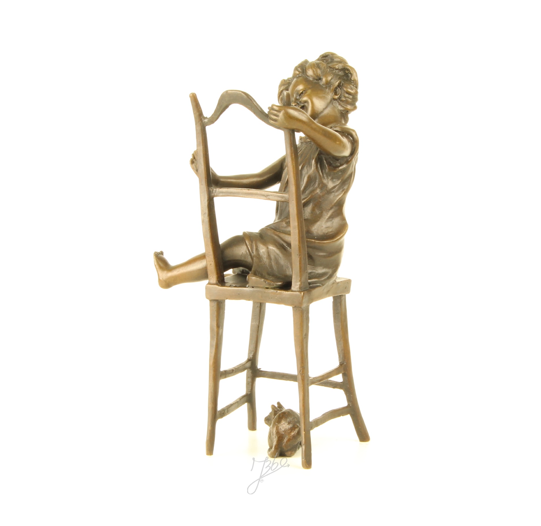 Ez a bronzszobor elbűvölően és szívmelengetően ábrázol egy fiatal lányt, aki játékos pillanatokat tölt macskatársával egy széken ülve.